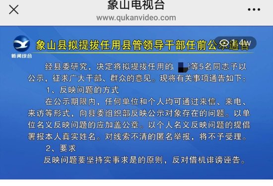 近日,网友反映,浙江象山县组织部在当地报纸发布的一则干部任前公示存在问题,相比于版面其他内容,公示内容做了模糊处理,质疑这样的公示“遮遮掩掩”,希望改进。当地仅回复了一句“任前公示情况通过电视台及报纸向社会通报”,并未解释原因。