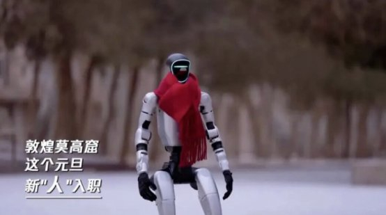 2026年元旦,在敦煌莫高窟数字展示中心,部署了Tairos具身大模型的宇树G1型号AI导览机器人“小莫”已经开始上岗实习担任讲解员,为来访的游客提供导览指引和敦煌文化的讲解互动。这也是全国首个结合具身智能大模型在文博场景落地的AI导览人形机器人。