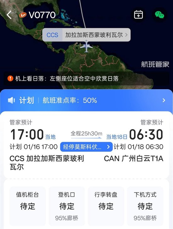 航班管家APP显示,广州往返加拉加斯的航线需经停莫斯科,全程约30个小时。1月16日从加拉加斯到广州的航班已显示正常,1月19日从广州到加拉加斯的航班也已正常。