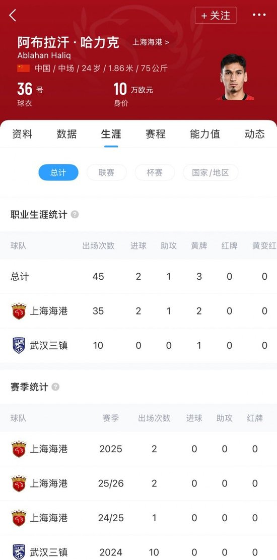阿布拉汗现年24岁,2021年加盟上海海港,期间曾被外租至武汉三镇。2025赛季阿布拉汗代表海港联赛出场2次,出场时间23分钟。
